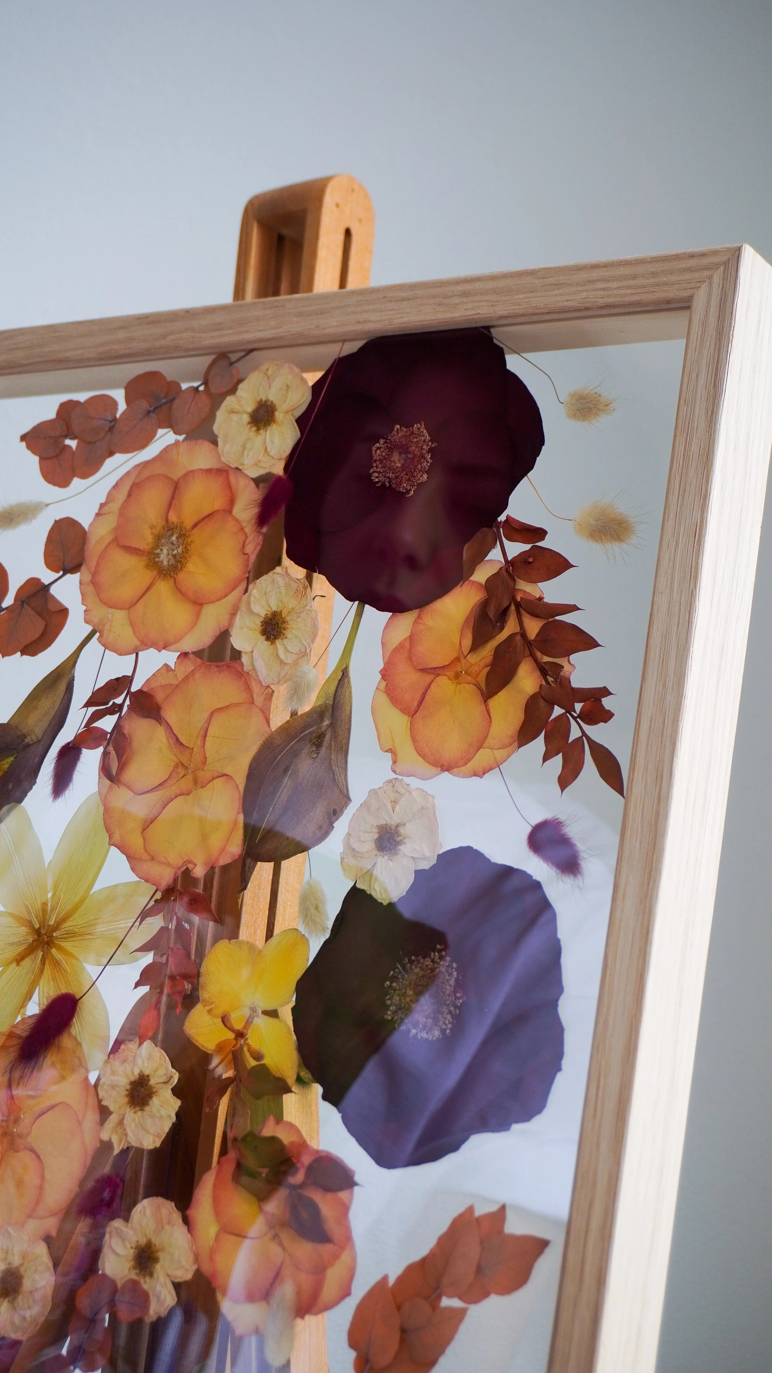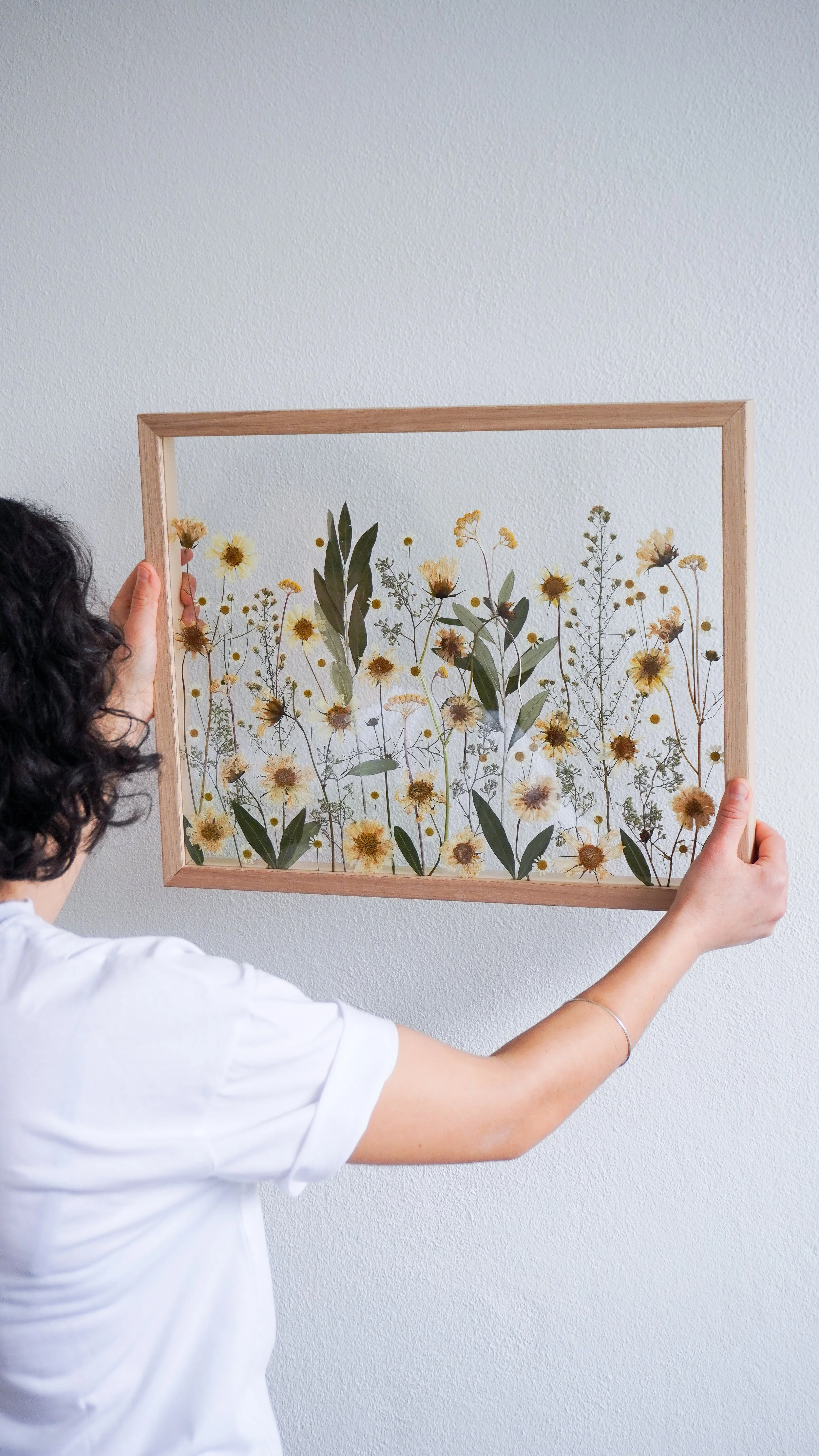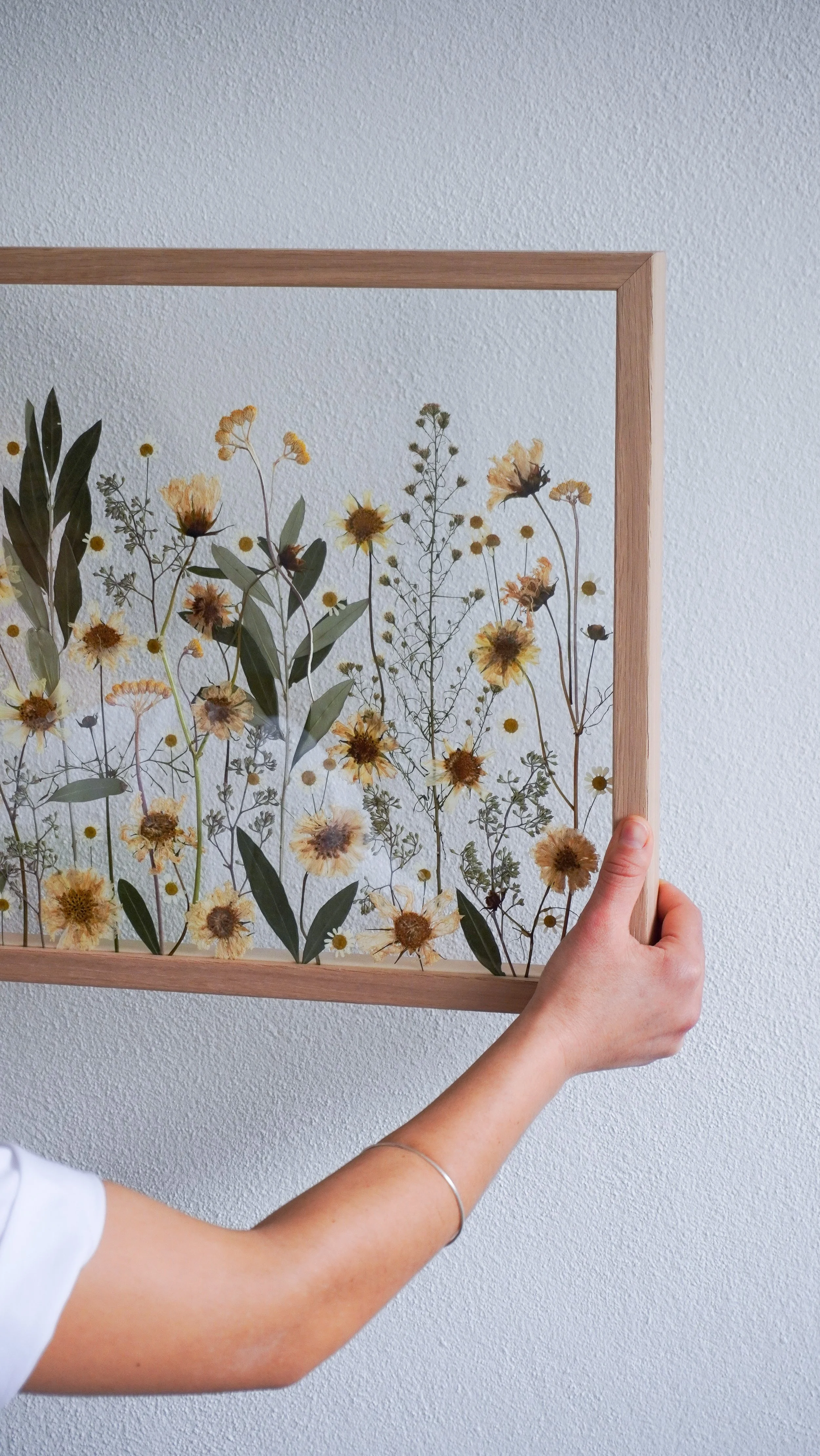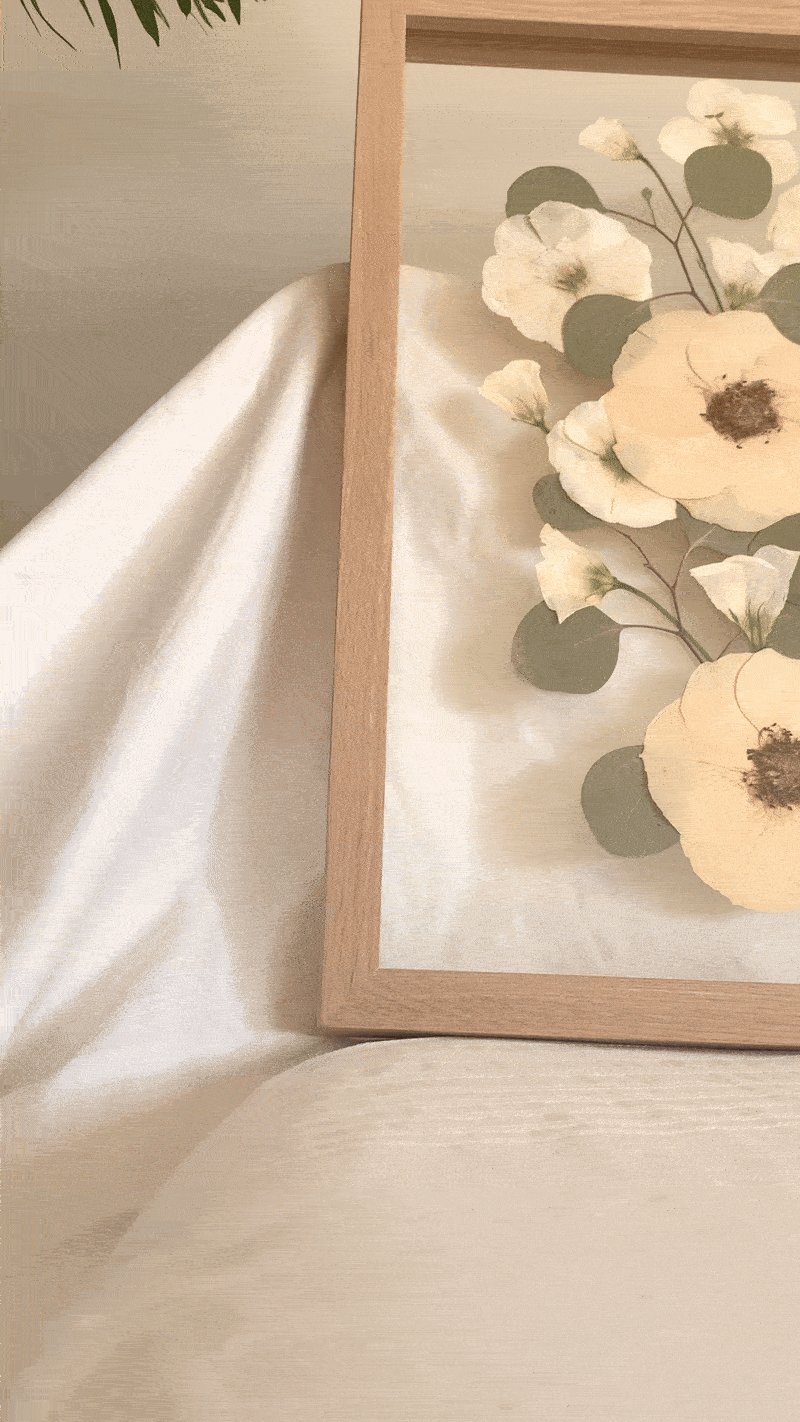 Nota: As flores prensadas podem durar uma vida, mas, por serem elementos naturais e orgânicos, é normal que as suas cores se vão alterando e tornando mais suaves ao longo dos anos. Vejo este processo como parte da beleza da peça, como se o quadro também guardasse a passagem do tempo. Para prolongar a cor e retardar este processo, evita expor o teu quadro em locais com luz solar direta, com muita humidade ou junto a fontes de calor intenso.