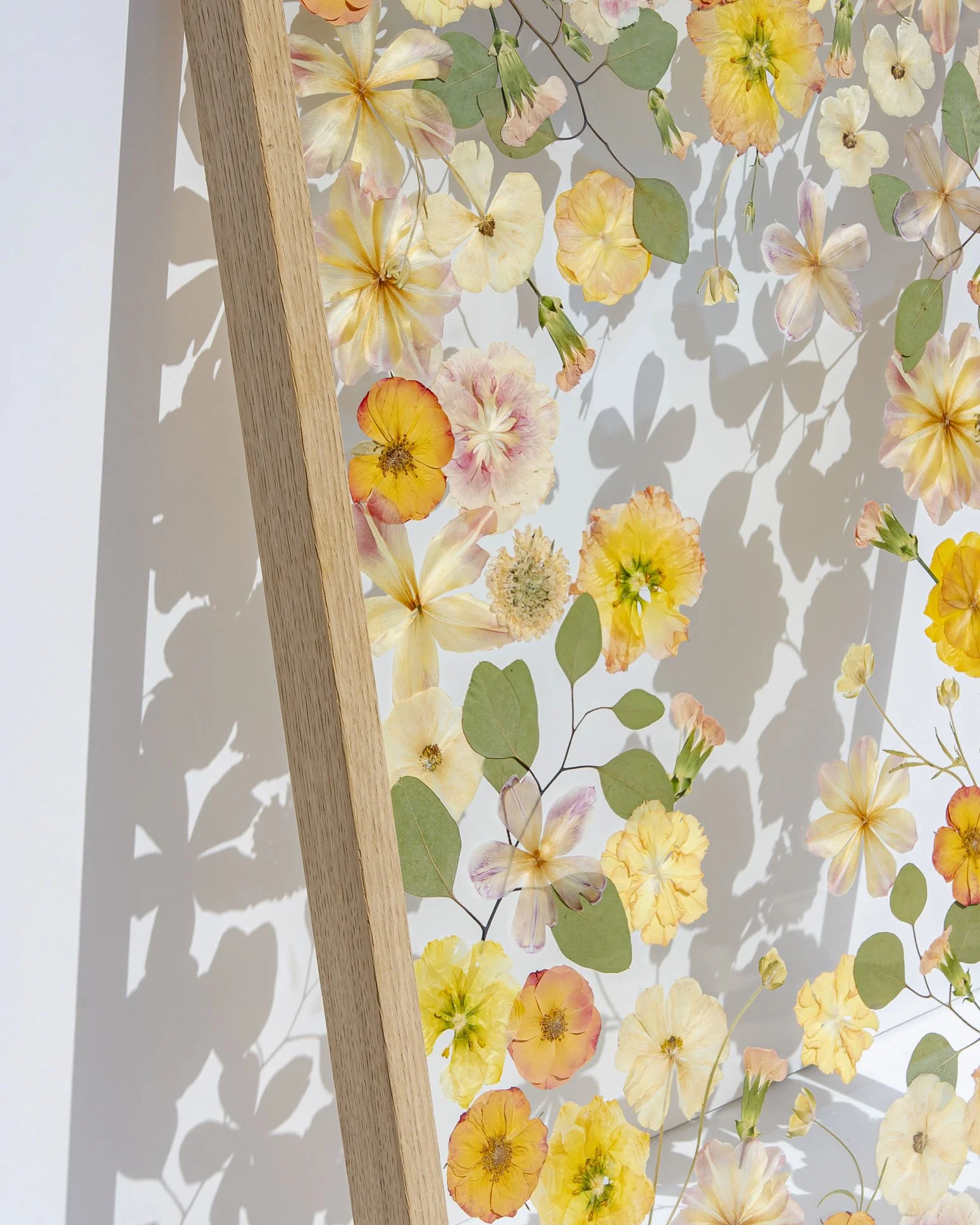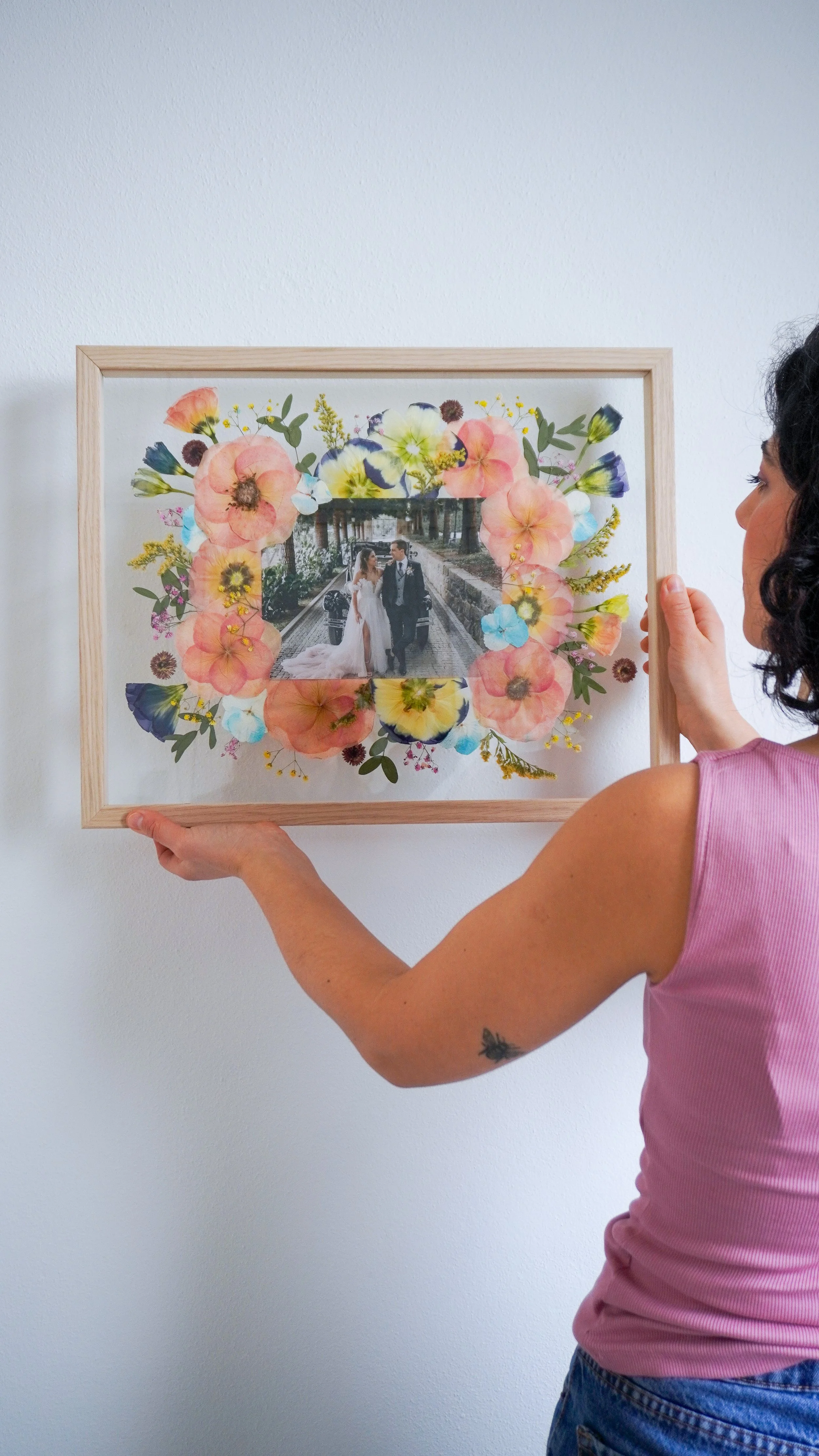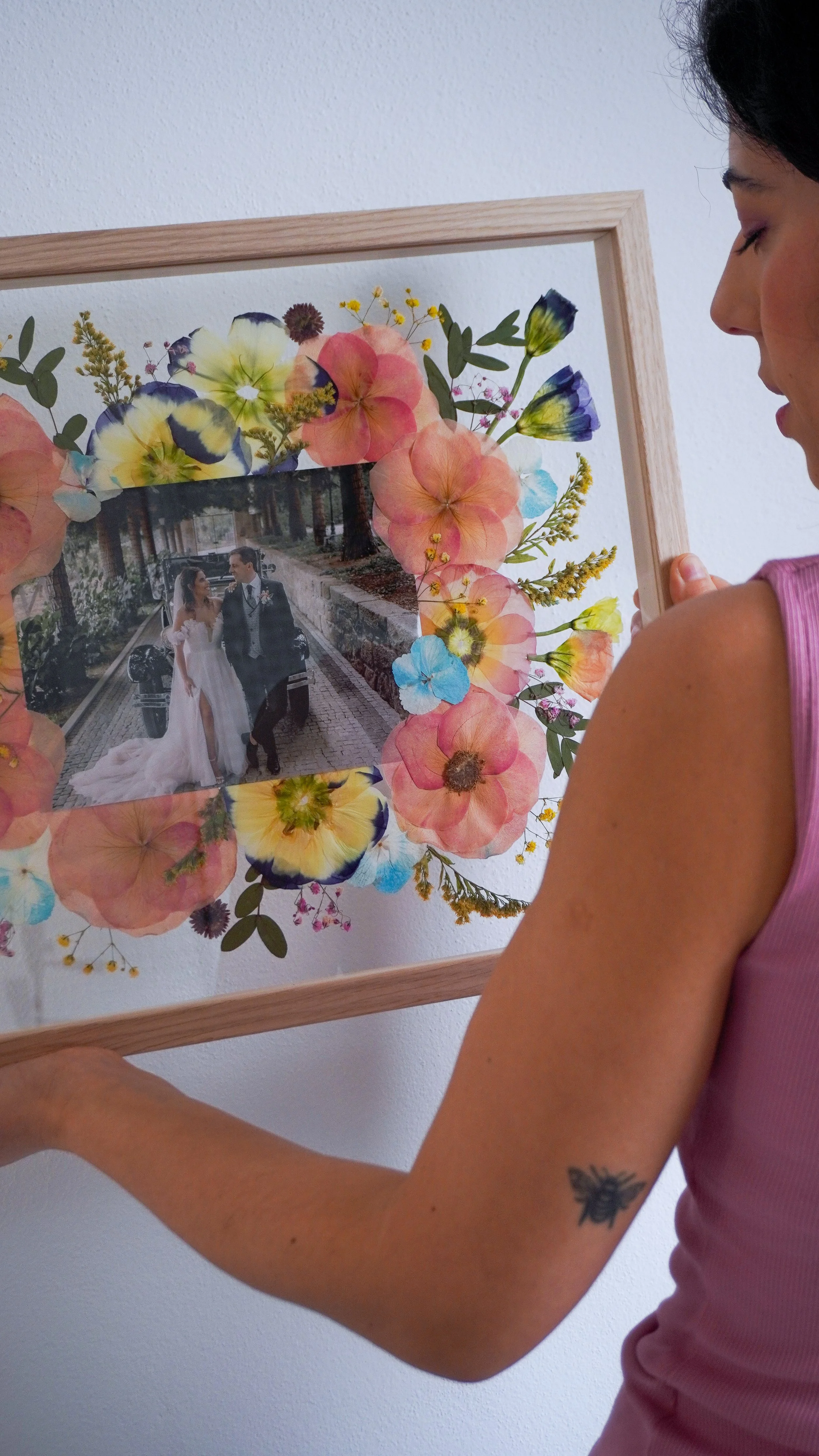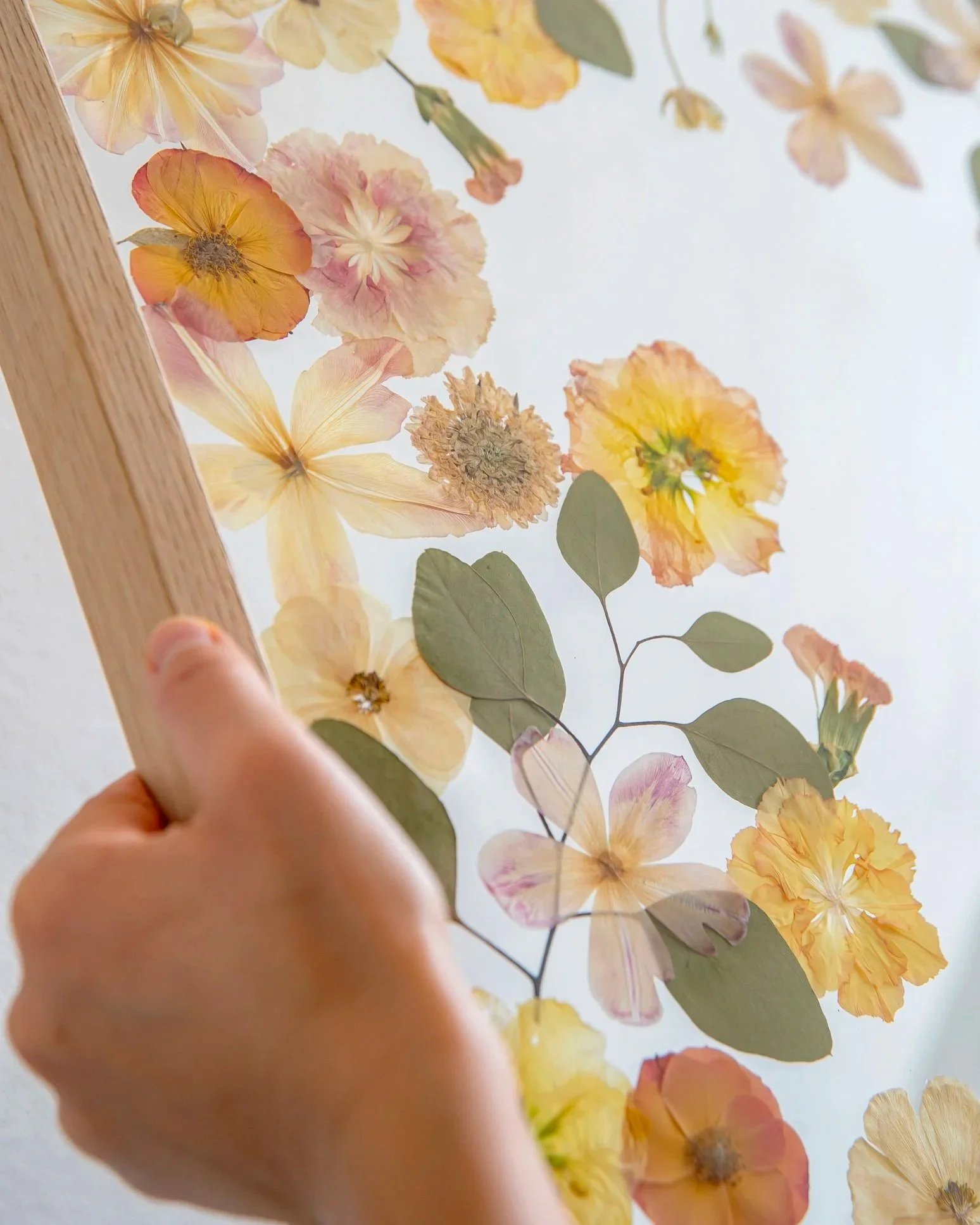 Nota: As flores prensadas podem durar uma vida, mas, por serem elementos naturais e orgânicos, é normal que as suas cores se vão alterando e tornando mais suaves ao longo dos anos. Vejo este processo como parte da beleza da peça, como se o quadro também guardasse a passagem do tempo. Para prolongar a cor e retardar este processo, evita expor o teu quadro em locais com luz solar direta, com muita humidade ou junto a fontes de calor intenso.